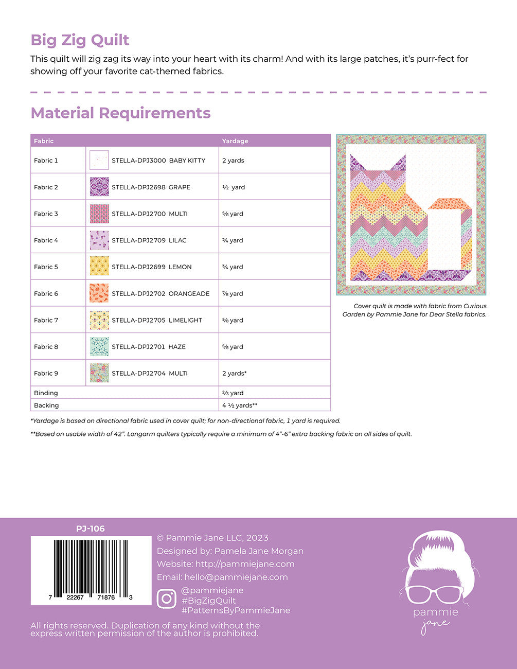 This quilt will zig zag its way into your heart with its charm! And with its large patches, it’s purr-fect for showing off your favorite cat-themed fabrics. Cover quilt is made with fabric from Curious Garden by Pammie Jane for Dear Stella fabrics.
