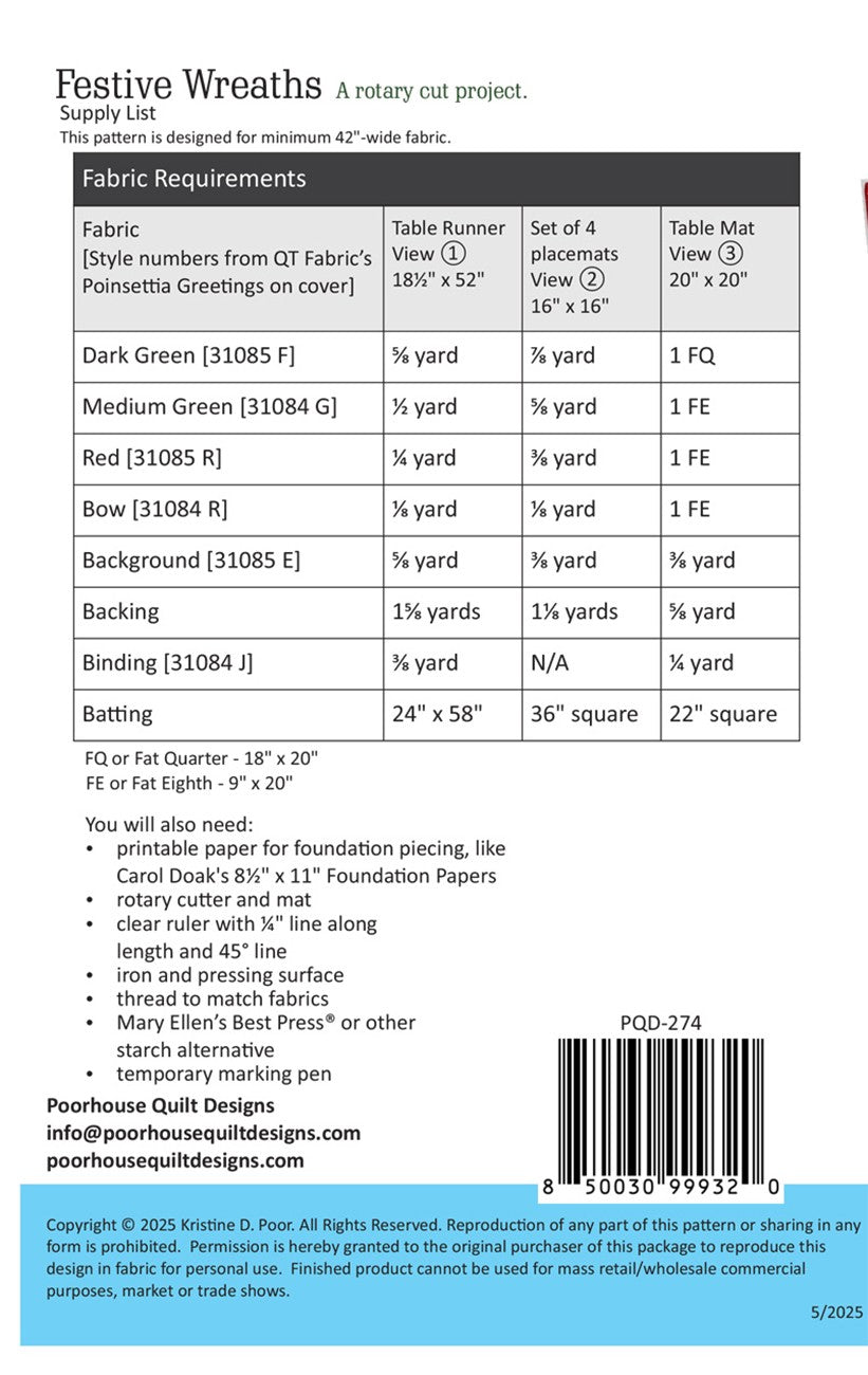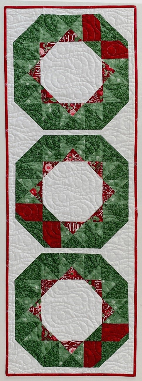 • Finished Sizes: 18½"" x 52"" table runner, a set of four 16"" placemats, and a 20” table mat.