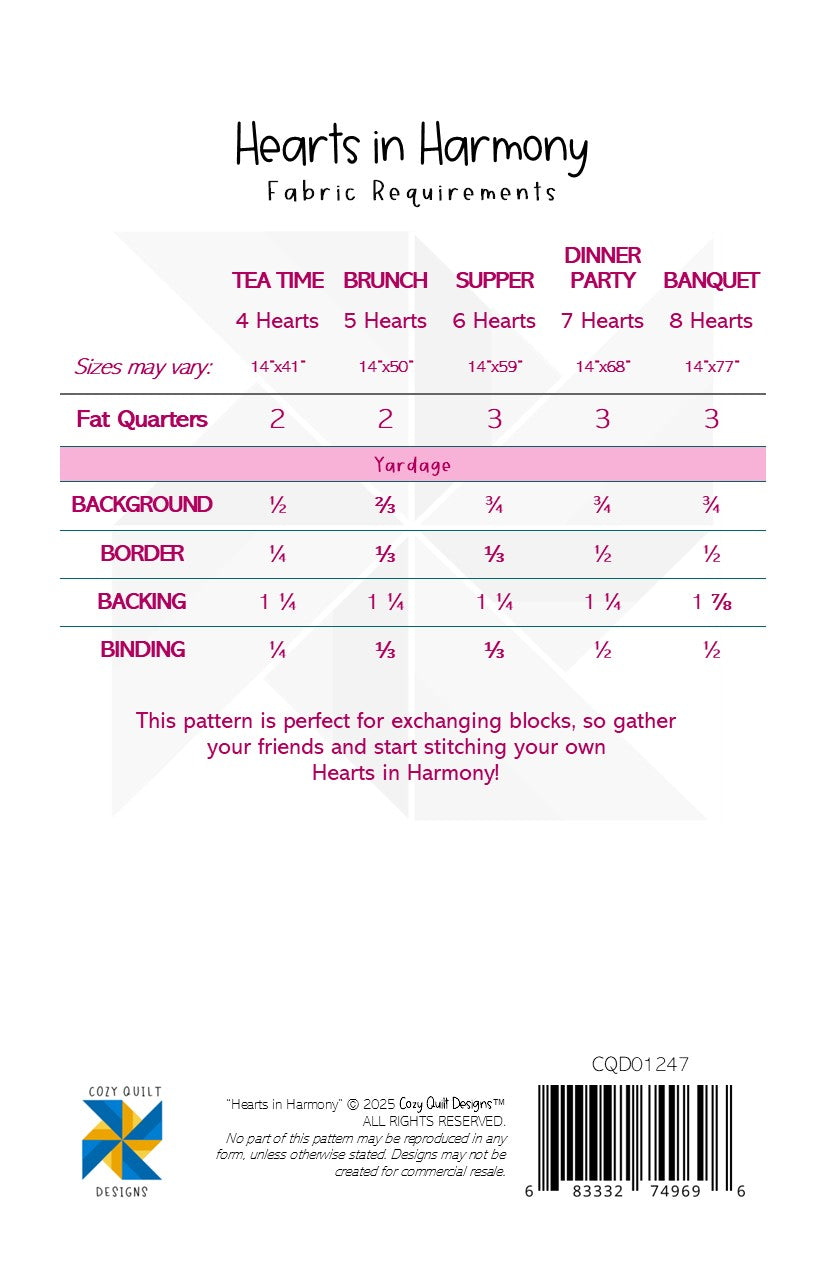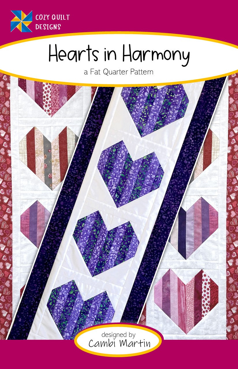 Stitching has never been more fun! Use this fat quarter-friendly pattern to create a table runner perfect for exchanging blocks with your besties (and impressing your in-laws). With this set, you'll have just the right size for every get-together, from cozy tea time to extravagant banquets. Hearts in Harmony - bringing friends and family together, one stitch at a time!