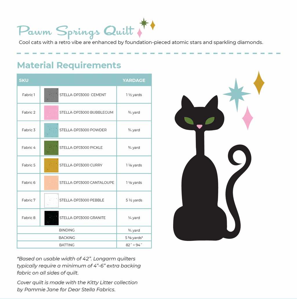 • Traditional and foundation paper piecing combine in a purr-fect intermediate level design. This mid-century styled quilt features cool cats with a retro vibe that are enhanced by foundation-pieced atomic stars and sparkling diamonds. Skill Level: Intermediate